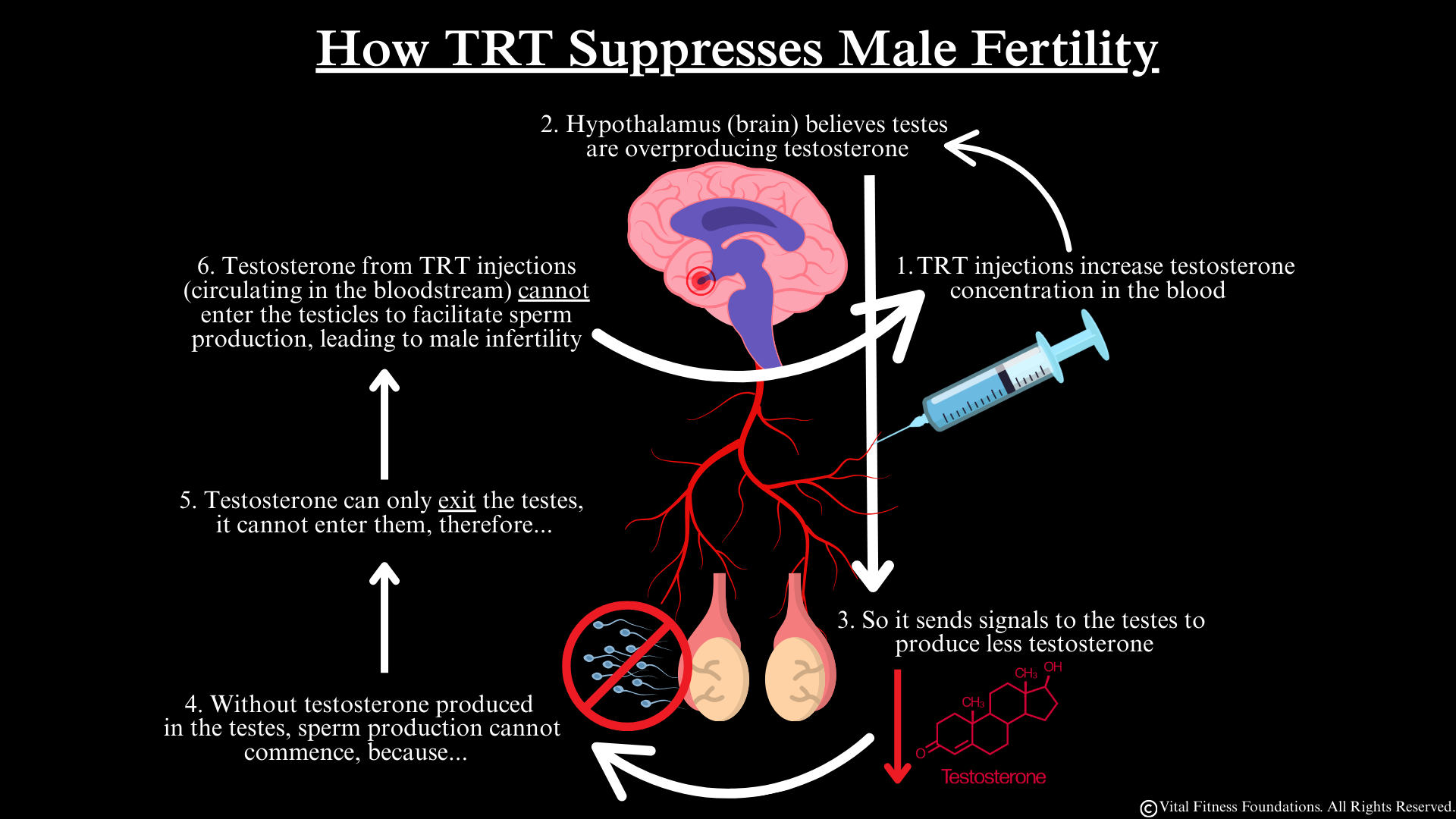 The problem is that only endogenous testosterone is capable of stimulating sperm production, not exogenous testosterone like TRT.