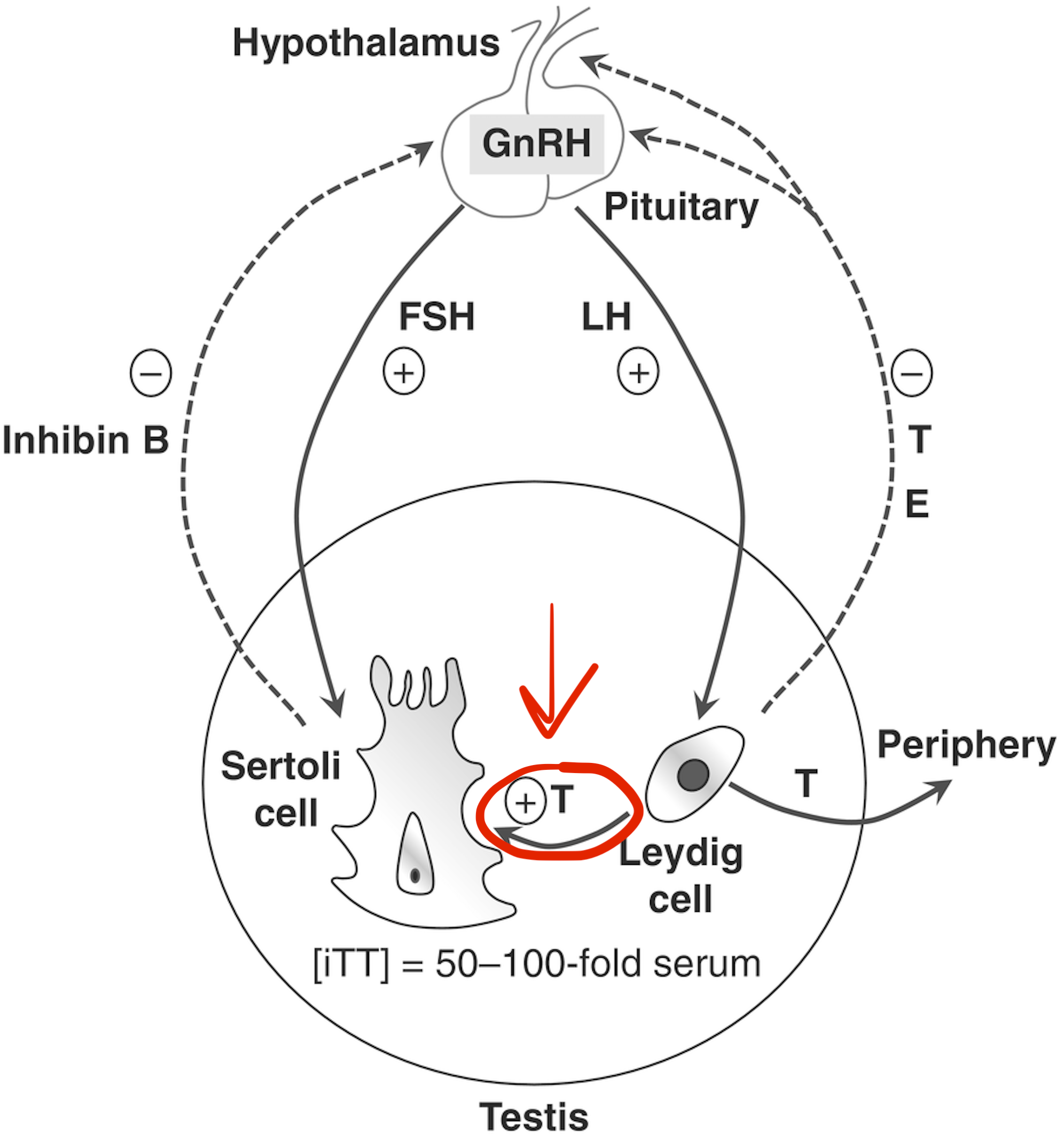 This is because testosterone can only exit the testes, so exogenous testosterone in the bloodstream cannot enter them to facilitate sperm production.