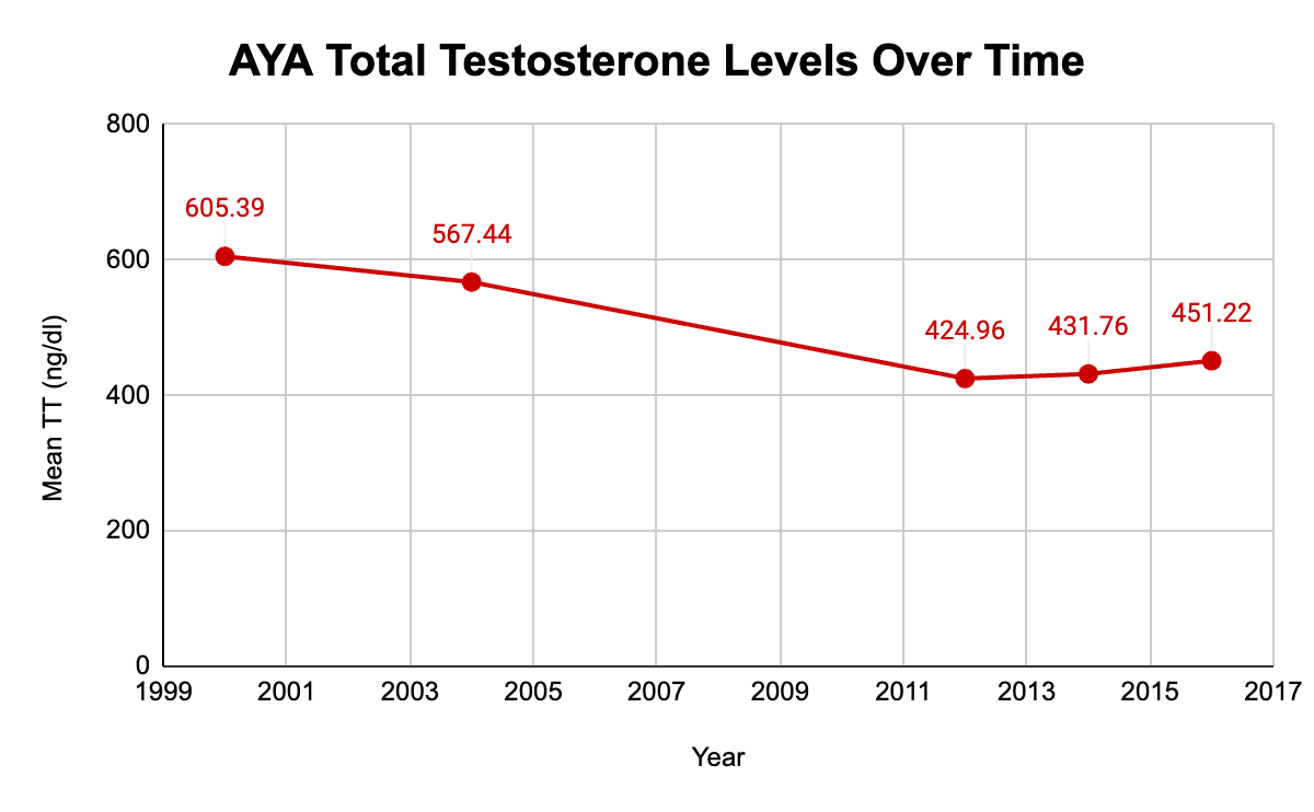 A 2021 study found a significant decline in the testosterone levels of men aged 15-39 (12), termed "adolescent and young adult males,” abbreviated as “AYA males.”