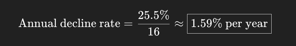 The researchers found that average testosterone fell from 605.39 ng/dL in 1999–2000 to 451.22 ng/dL in 2016 (p < 0.001), a 25.5% decrease.